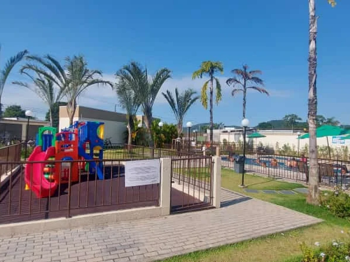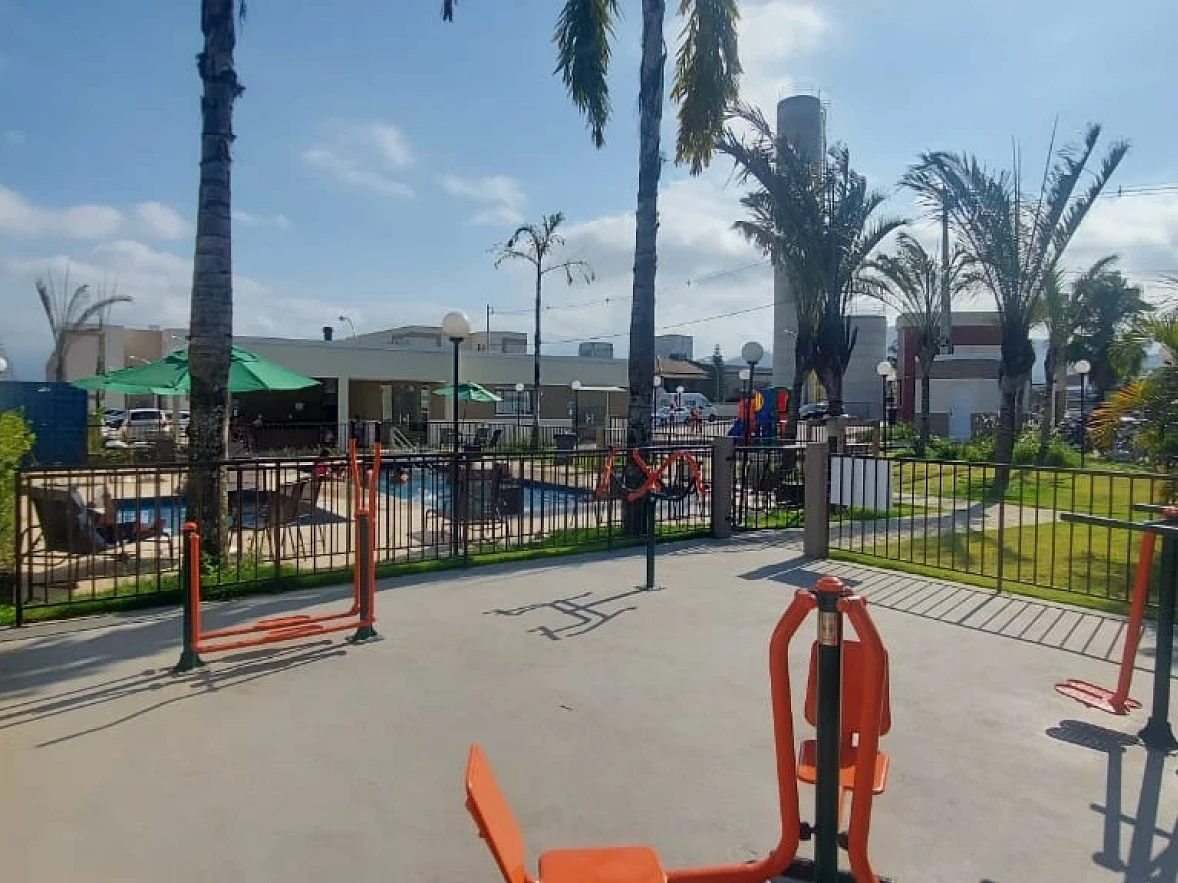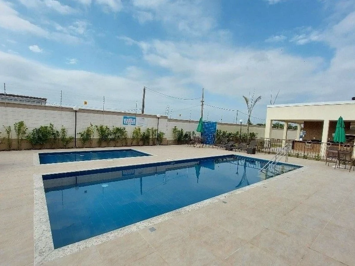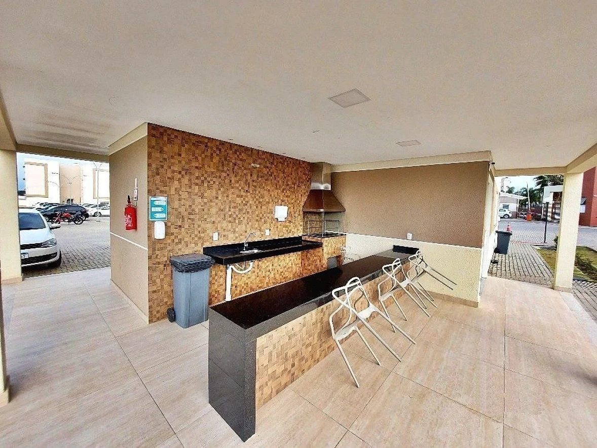 Empreendimento: O Condomínio oferece portaria 24 com câmaras, piscina, mini mercado, praça infantil, quadra esportiva, salão de festa, quiosque e gás central