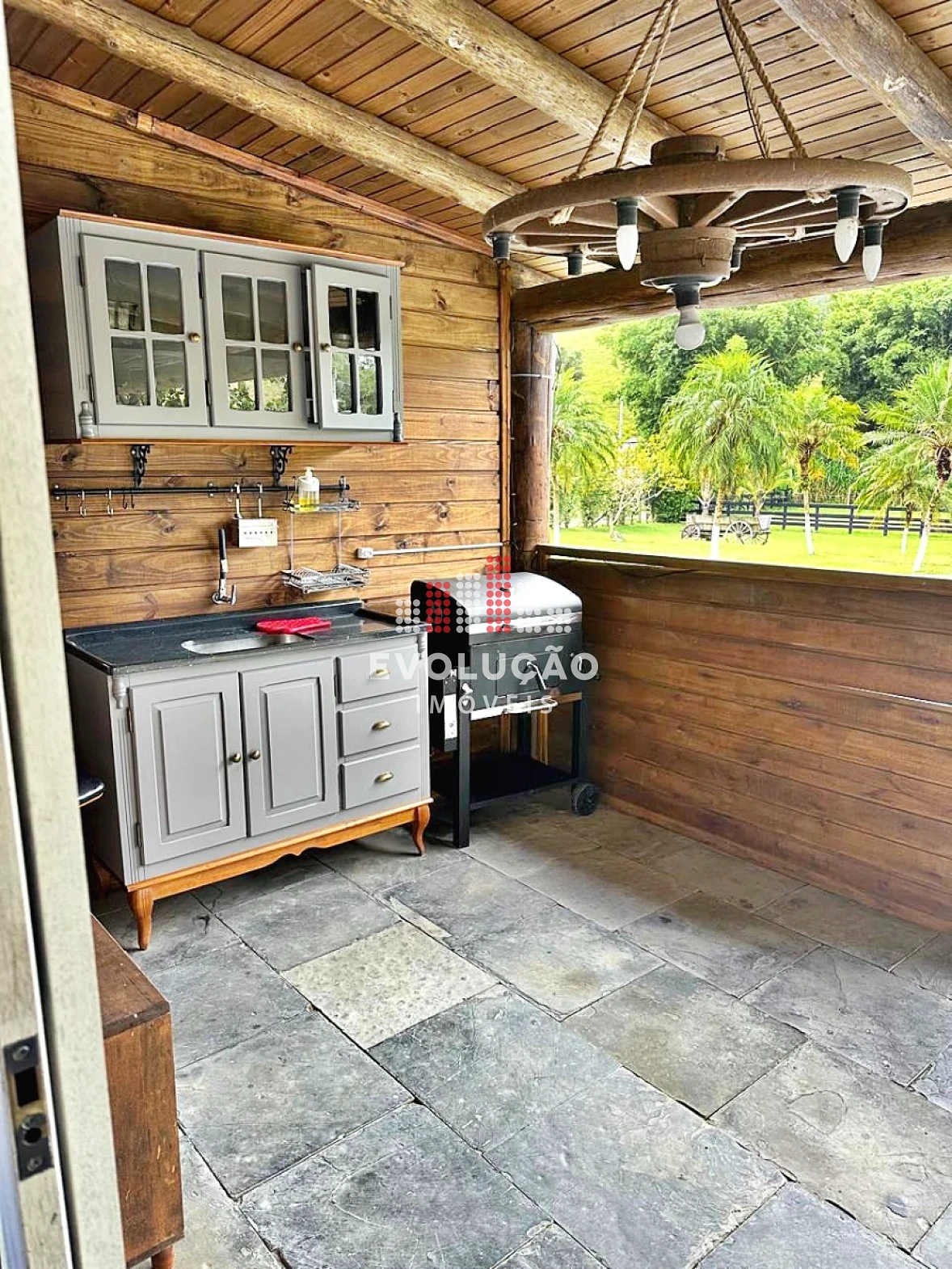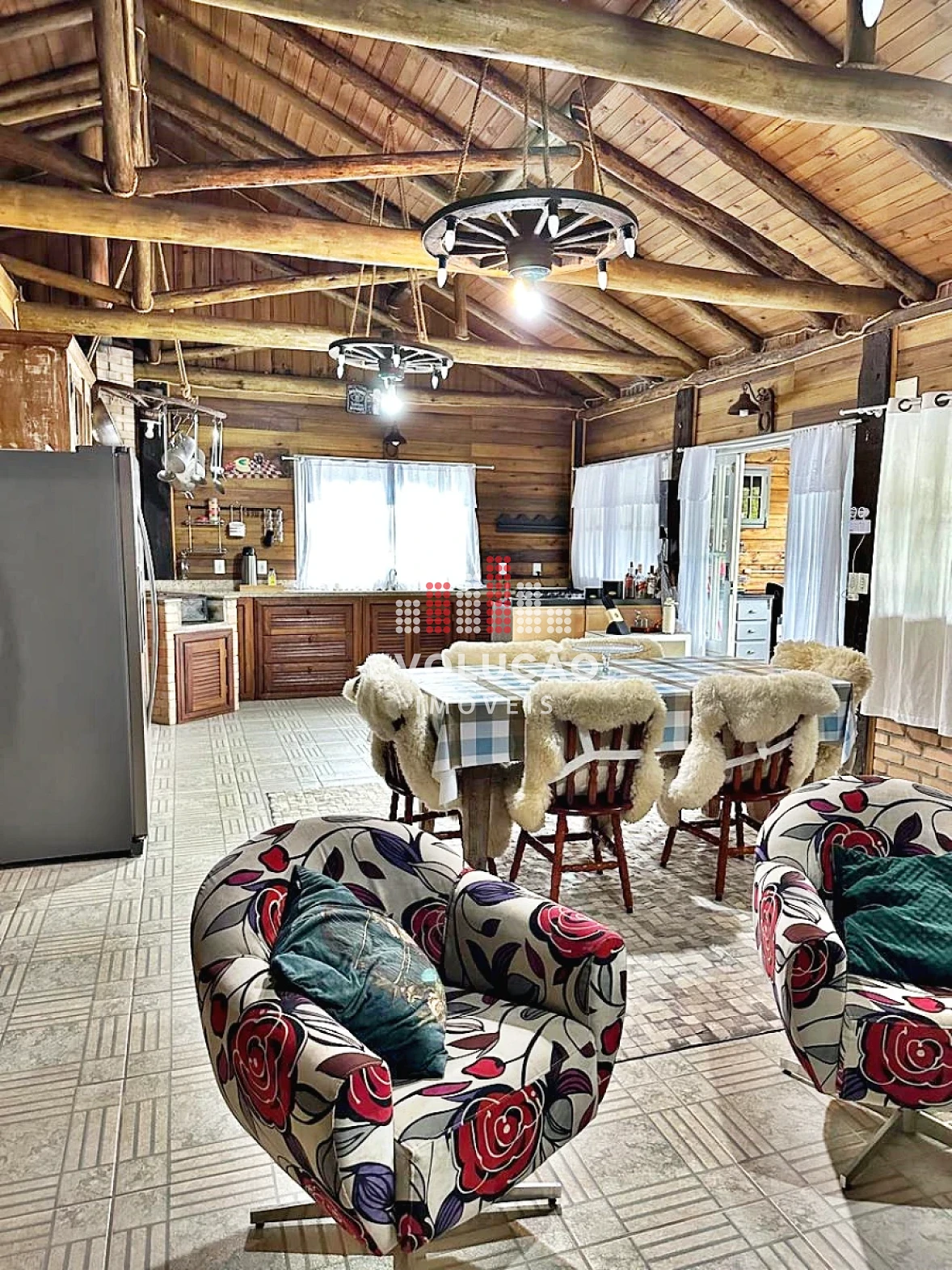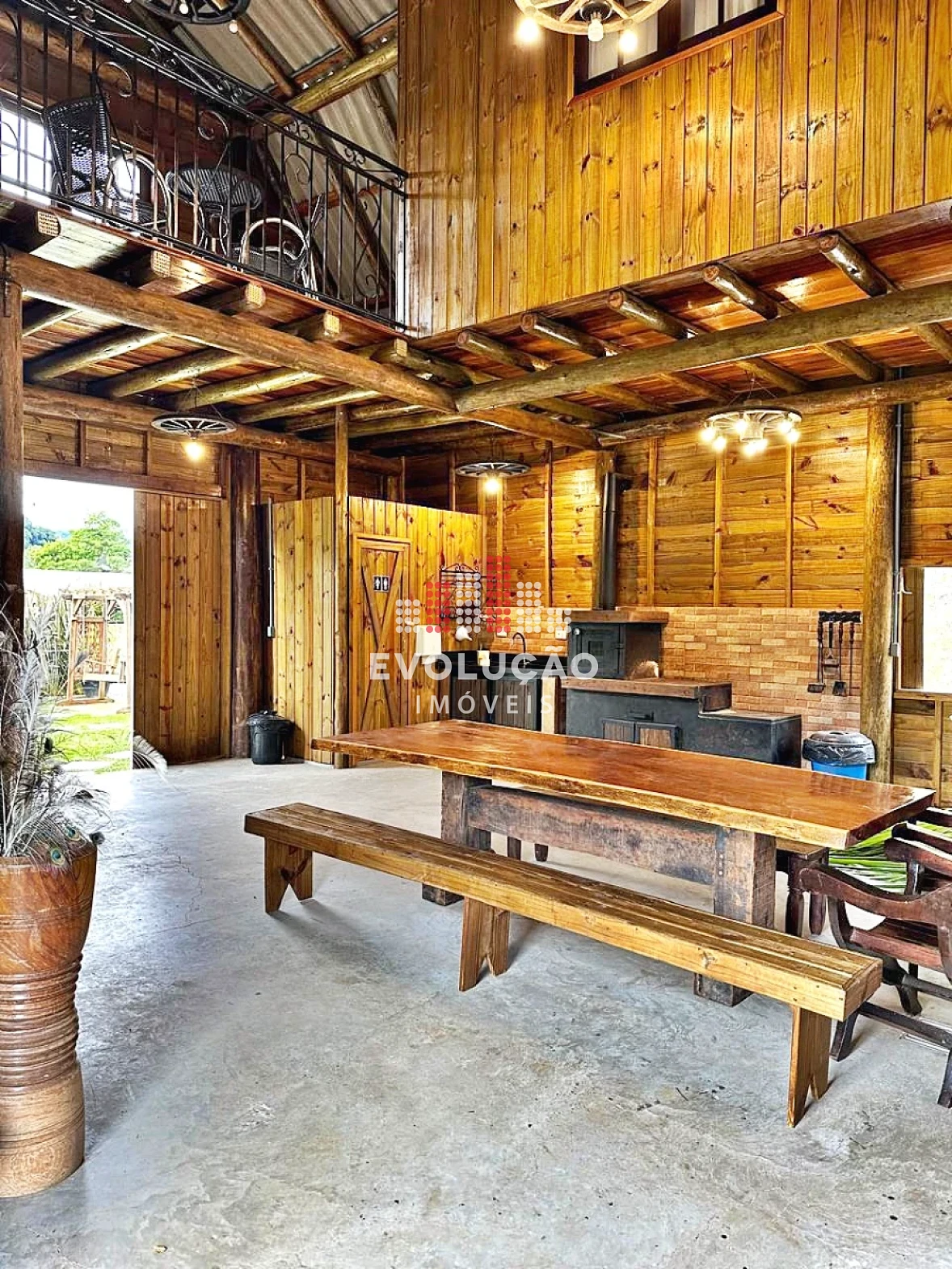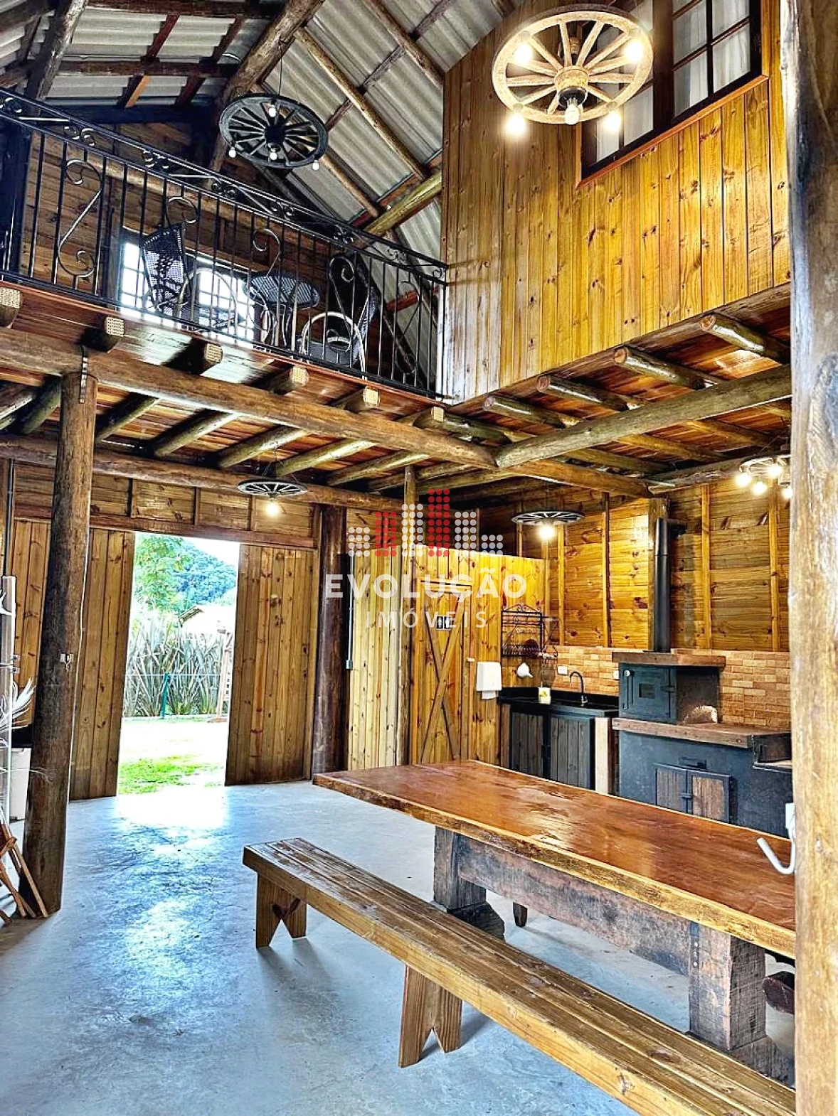 * Rancho estilo Americano, onde possui 2 pavimentos, onde possui 1 dormitório no piso superior, com um completo espaço gourmet, contendo forno, fogão a lenha, churrasqueira, espaço para ordenha e tratamento para animais confinados;