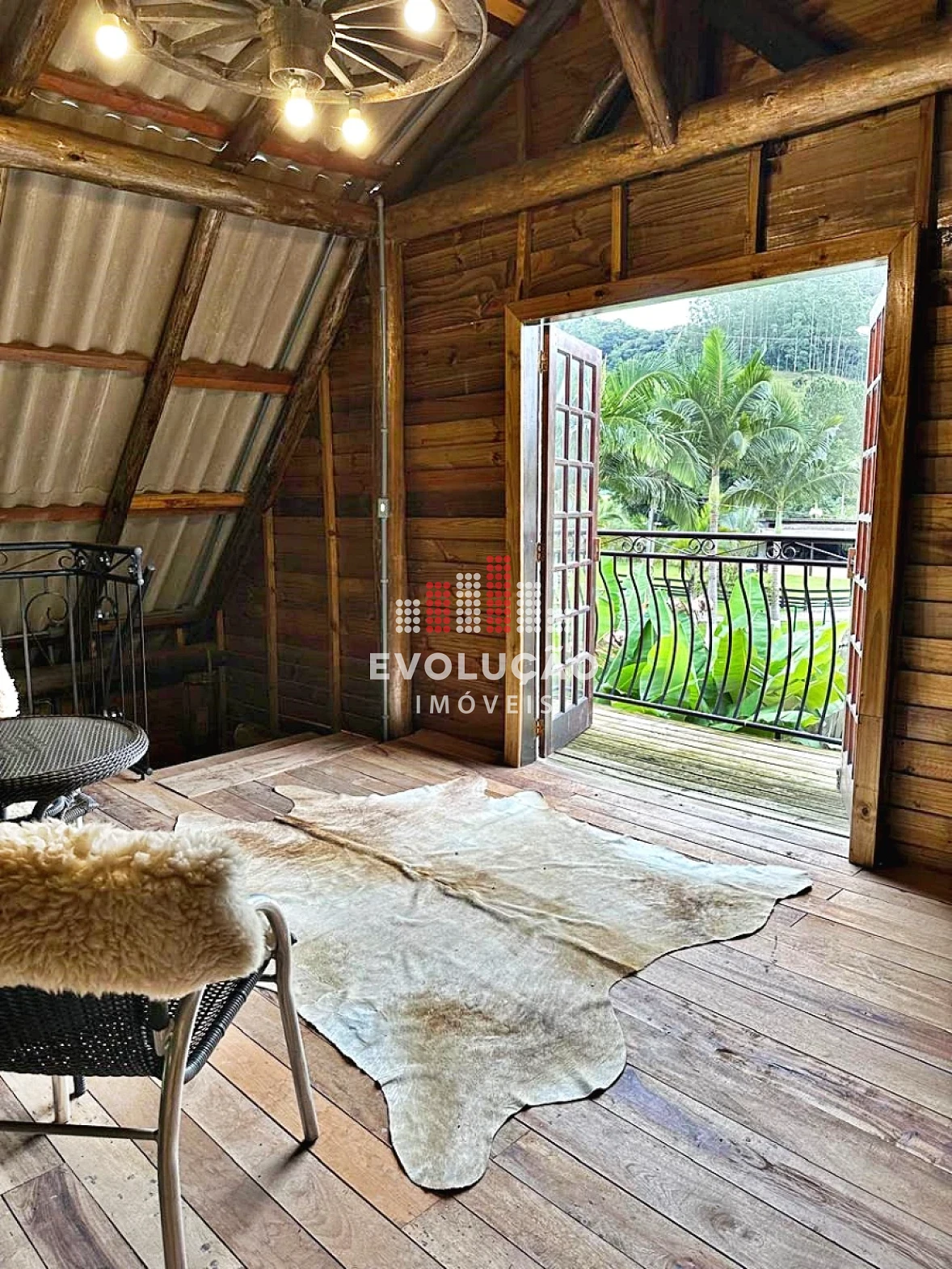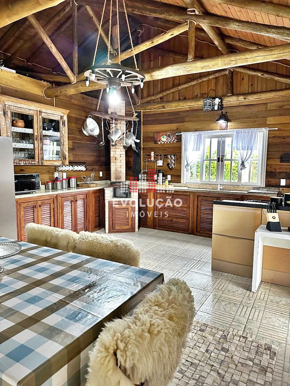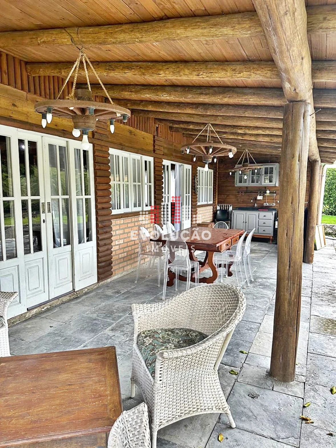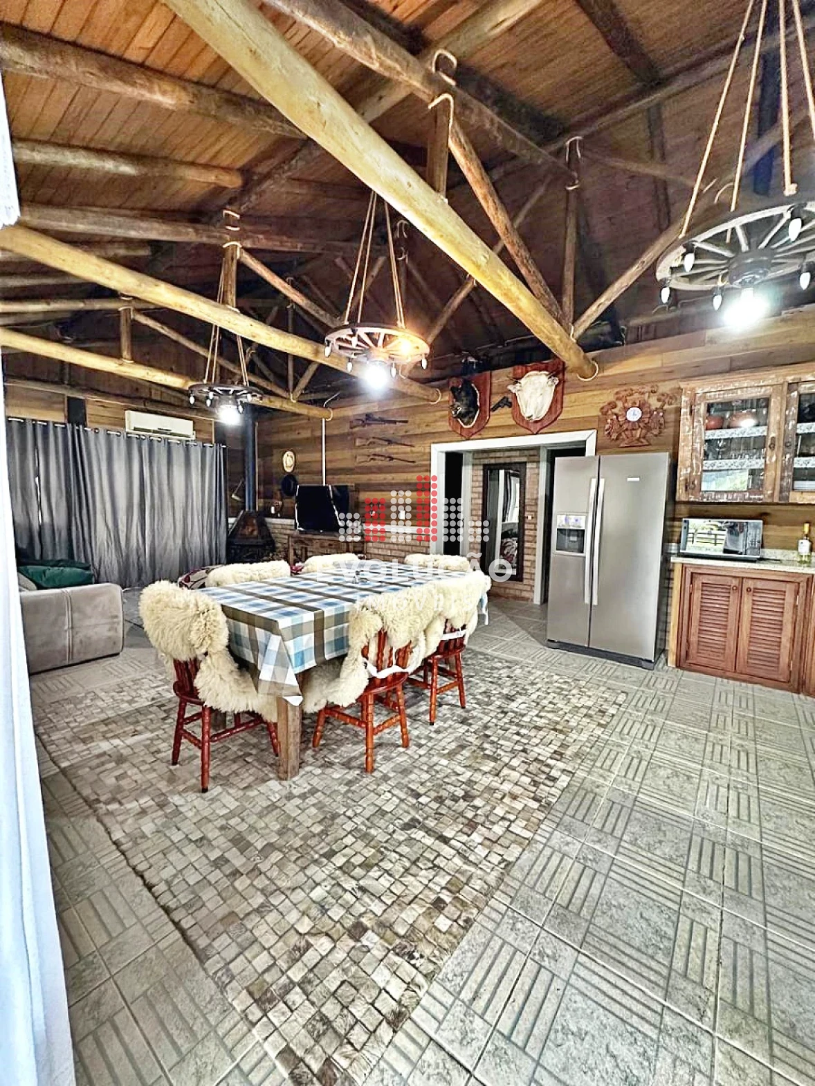 * Rancho estilo Americano, onde possui 2 pavimentos, onde possui 1 dormitório no piso superior, com um completo espaço gourmet, contendo forno, fogão a lenha, churrasqueira, espaço para ordenha e tratamento para animais confinados;